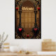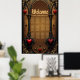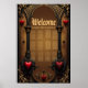 Amor eterno a la sombra de la oscuridad gótica. El marco ornamentado, inspirado en la arquitectura gótica, se compone de dos majestuosas columnas negras adornadas con delicados acentos dorados. Estas columnas enmarcan una gran abertura abovedada que brilla sobre un fondo marrón cálido, lo que contrasta perfectamente con los elementos oscuros. Delicados corazones rojos están parcialmente envueltos en fina telaraña.