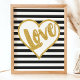 Hermosa cita moderna de escritura de escritura moderna y moderna de tipografía. "Amor". Presenta un marco purpurina de corazón metálico de bonito y letras doradas con rayas blancas y negras.