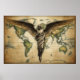 A large Angel covering a world map, on a wall poster.