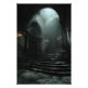A monumental stone staircase rises through swirling mist inside a decayed Gothic cathedral, illuminated by soft daylight streaming through a broken oculus high above. Tall arches, cracked columns, and an imposing carved door stand in solemn silence, their surfaces aged by time and water, while faint sconce light adds warm flickers to the cold gray stone. The atmosphere is heavy with reverence, melancholy, forgotten sanctity, and the quiet pull toward transcendence—ideal for meditation rooms, moody bedrooms, home offices, therapy spaces, gothic-themed reading nooks, or as evocative gifts for lovers of ancient architecture, spiritual introspection, dark romanticism, fantasy ruins, or anyone drawn to haunting, atmospheric depth.