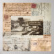 A vintage postcard of the coliseum in Rome is featured in this lovely and sophisticated collage art along with the stamp and Roman postmark on the back, an Italian manuscript from the 1200s, vintage calligraphy advertising typography and an old 100 Lira stamp. Digital collage by artist Anita Barnard, This design is also available as a throw pillow, apron and candy jar, with other matching Italian products available in my Zazzle store.