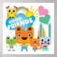 Amigos animales, amables, coloridos y divertidos, diseñan camisetas, bibs, mantas, paños para la pared, juegos de baño, relojes de pared, bolsas, tazas, aguijonetas y más detalles como un búho, oso, ardilla, conejo conejo y rana, un sol, arco iris, corazones y nube con texto que lee ¡Buenos amigos!