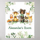 Póster de animales del bosque en acuarela. Animales bebés que incluyen oso con lazo verde, ciervo, alce, mapache, conejo, zorro y búho sobre hojas de eucalipto y vegetación del bosque. Agregar nombre.