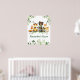 Póster de animales del bosque en acuarela. Animales bebés incluyen oso con lazo verde, ciervo, alce, mapache, conejo, zorro y búho en hojas de eucalipto y follaje del bosque. Agregar nombre.