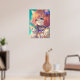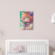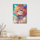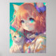 Hermoso chica de Anime con dos ojos azules sosteniendo un gatito adorable. Los colores utilizados son rosa, verde azulado, naranja, azul, violeta y azul. Ai art. generatvientent para niños, lindo y colorido