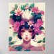 Poster in an illustration of a stylized anime girl with delicate features, her dark hair adorned with vibrant pink lotuses, lush green leaves, and a large white lotus crowning her head.