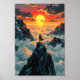 An inspiring anime scene capturing sunrise from above the clouds at mountain peak.