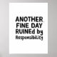 A humorous and relatable typography design capturing the universal feeling of dread when duties interrupt a good time. The text, "ANOTHER FINE DAY RUINED by Responsibility," is presented in a bold, slightly distressed font, emphasizing the sarcastic tone. This design is perfect for anyone feeling overwhelmed by their to-do list, procrastinators, or those who appreciate witty and cynical humor about adult life and the daily grind. It makes a great statement piece for casual wear or home decor.