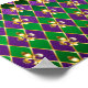 joyas, fondo del Mardi Gras de rhombus violeta y verde, lirios dorados decorados.