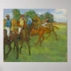 Antes de la carrera (1887-1889) de Edgar Degas es una pintura icónica que capta la tensión y la anticipación antes de una carrera de caballos. La escena está puesta en un establo, donde un grupo de jinetes se prepara para la carrera por delante. La pintura retrata con gusto el movimiento dinámico de los jinetes y caballos, haciendo hincapié en la muscularidad de los caballos y en las posturas concentradas de los jinetes. El uso distintivo de Degas de tonos ricos y tierra y el trabajo detallado de pinceles crea un sentido de inmediatez y energía. La composición enfatiza los momentos tranquilos pero intensos antes de la emoción de la carrera. El trabajo refleja la profunda comprensión de Degas del cuerpo humano y su fascinación por el movimiento, lo que lo convierte en un ejemplo definitorio de su maestría en capturar los fugaces momentos de acción.