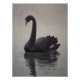 An elegant black swan glides calmly across still water, its reflection rippling beneath it.