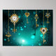 Gold, antique keys with gears and dials hang on gold chains on luminous green background.