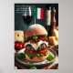 Descubre un tesoro milanés con esta deliciosa Hamburguesa Italiana de Trufa. Una jugosa hamburguesa de ternera infusionada con fragante aceite de trufa negra se combina con cremosa mozzarella fresca, dulces tomates secos y vibrante pesto de albahaca, todo apilado en un crujiente pan ciabatta. Una pequeña bandera italiana añade un toque de estilo italiano, mientras que el parmesano envejecido y una copa de vino blanco crujiente proporcionan un telón de fondo adecuado, lo que hace que esta sea una verdadera experiencia culinaria italiana.