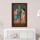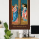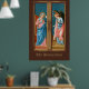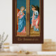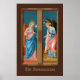 ℣. El Ángel del Señor le declaró a María, ℟. Y ella concibió el Espíritu Santo". Así, comienza la oración de tres días de Angelus a la Santísima Virgen María (BVM) que conmemora la encarnación en la Anunciación. + La Anunciación fue un tema inmensamente popular en el arte de la Edad Media y el Renacimiento. Como composición de dos personas, el sujeto se prestó a su uso en las hojas exteriores de los triptillos: el ángel de una hoja; Mary, por la otra. Un tríptico es una obra de arte —la mayoría de las veces una pintura de panel— que consiste de tres partes unidas de tal manera que se puede mostrar abierta o doblada cerrada. + Aquí, Filippo Lippi (1406-1469) ha pintado la Anunciación a temperatura sobre madera en rosados cálidos, salmones y rojos y en blues brillante y oscuro. Ambas figuras se encuentran en sus estrechos espacios respectivos, el Arcángel Gabriel inclinándose un poco ante la dulce y dulcemente destacada doncella María. A + Saints_Ainfinito le gusta el fondo marrón oscuro de esta imagen. Un fondo marrón oscuro da a los espectadores la impresión de que son espectadores observando la escena a través de una ventana. Pero, como de costumbre, hemos proporcionado una postal de la Paleta de Color para otros tonos sugeridos. + Fiesta de la Anunciación: 25 de marzo; Fiesta de San Gabriel el Arcángel: 29 de septiembre + Crédito de la imagen (M 038): Imagen antigua de la Anunciación de Filippo Lippi (1406-1469) de una postal de finales del siglo XIX y principios del siglo XX publicada originalmente por cromolitografía E. Sborgi, Florencia, Italia, de la colección privada de ephemera religiosa del diseñador. Los paneles originales de un poliptílico de origen desconocido se encuentran en la sala Filippo y Filippino de la Galería Uffizi en Florencia. La Anunciación forma las mitades superiores de las dos hojas mientras que SS. Anthony Abbott y John el Bautista aparecen en la parte inferior izquierda y en la parte inferior derecha, respectivamente.