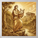 Inspired by classical mythology and antique illustration traditions, this artwork portrays Apollo as the luminous figure of the Olympian pantheon, surrounded by the quiet beauty of the natural world and the temples of ancient Greece.
