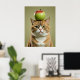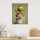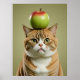 Un gato gracioso con una manzana balanceándose encima de su cabeza.