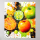 Experimente la energía de la fruta fresca en esta impresionante obra de arte. Las manchas de color vibrante crean una composición dinámica con manzanas, naranjas y limas (Este diseño hecho con IA). ¡Haga el pedido hoy y acepte la alegría de ir de compras!