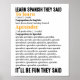 Aprende español, dicen, será divertido que digan vestimenta divertida para mujeres, hombres y niños. Ensamblaje humorístico con conjugaciones en inglés y español para aprender verbo y aprender aprender, para los que quieren aprender español, es una gran idea presente para papá, mamá, hijo, hija, sobrina, sobrina, esposa, esposo, amigo, compañero de trabajo... Gran vestimenta para los amantes de las conjugaciones, conjunto divertido para los hablantes de inglés y español y los amantes del chiste. Gran idea de regalo para el día del padre, el día de la madre, el cumpleaños...
