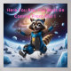 Aquí están, deben estar viniendo de lejos: simpático robot mapache caminando en un planeta helado