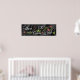 Una pancarta boda "Here Comes The Bride" (Aquí viene la novia) en caligrafía, decorada con flores naranjas y vegetación sobre un fondo de color negro.