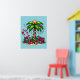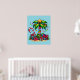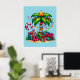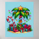 Poster con una imagen de temporada de vacaciones. Una palmera tropical adornada con luces festivas y una estrella en la parte superior. Un enorme bastón de caramelo rojo y blanco saliendo de la arena. Regalos de Navidad debajo del árbol. Genial y divertido.