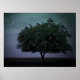 Árbol único en campo rural con luna y estrellas en el cielo crepúsculo.