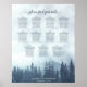 Esta elegante tabla de bodas tiene mesas para 110 invitados en 11 mesas (10 personas por mesa). El diseño es rústico y elegante, con un paisaje montañoso de bosques y una colina cubierta por un bosque de pinos azul. El título dice "por favor, encuentra tu mesa" en caligrafía de escritura de encaje. Hay espacio para los nombres de la pareja y la fecha de boda.