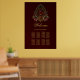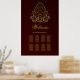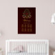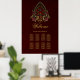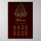 Arco gótico con calaveras. Un gran arco gótico se alza majestuosamente sobre un fondo rojo misterioso y profundo, decorado con detalles ornamentales. Los dos grandes pilares, adornados con delicados tallados, dan a la imagen una elegancia conmovedora. En el centro del arco brilla una impresionante vidriera, cuyo motivo central es una araña, símbolo de paciencia y creatividad. Rodeado por dos cráneos dorados, que recuerdan tanto a la transitoriedad como al amor eterno, el arco cautiva al espectador y promete una celebración llena de misterio y fascinación.