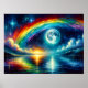 Un ilustracion de un arcoiris brillante sobre la luna.
