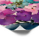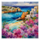 "Arcos En El Mar". Una vista idílica de una hermosa bahía, con un solo barco. Una pequeña playa de arena está rodeada por un hermoso mar azul y flores rosas y violetas.