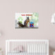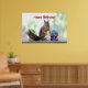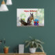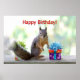 Foto de una ardilla linda parada al lado de dos pequeños regalos envueltos y mirando directamente a la cámara. "¡Feliz cumpleaños!" es la leyenda, de tipo rojo.