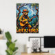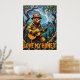 Esta encantadora obra de arte cuenta con un oso vestido de bombero, con casco y gafas de sol, tocando una guitarra acústica mientras se coloca sobre una sólida rama de árbol en un bosque exuberante. Un frasco de miel cuelga de una rama superior encima de él. El fondo muestra árboles altos y follaje en un bosque de poca luz. El cuadro utiliza pinceladas gruesas y texturadas, que le dan un aire caprichoso y reconfortante, con "Amar a mi miel" escrito a continuación.