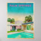 Poster de Palm Springs de época que muestra una casa de mediados de siglo con palmeras y piscina. La casa está decorada en tonos rosas y azules, con las montañas como telón de fondo.