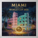 A breathtaking sunset vision of Miami as a World Cup 2026 host city — bold gold script floats above a warmly lit Art Deco boulevard as a glowing golden soccer ball dominates the foreground against a dramatic amber and teal sky. Hand-painted texture and rich jewel tones make this a collector-quality statement piece for Miami soccer fans and World Cup visitors.