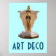 Un clásico poster de arte deco de la época del estilo y del diseño. El poster tiene una estatua metalizado de una mujer montada sobre una base de piedra. La figura tiene los brazos extendidos y la bata está empapada y bajando de los brazos.