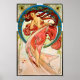 1898 Art Nouveau lithograph poster by Czech artist, Alphonse Mucha (1860-1939). Beautiful woman in a red dress, flowers in her long, flowing, bright red hair, her back arched, looking over bared shoulders, standing on her toes.