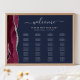 El borde izquierdo de este elegante y moderno gráfico de asientos bodas cuenta con un borde de acuarela de color burdeos recortado con un falso purpurina de plata. La palabra "bienvenida" aparece en la parte superior en un elegante guión de escritura gris plateado con toques al principio y al final. Personalizar con los nombres de la novia y del novio y la fecha del boda en cursiva. Edita las cuatro columnas con una lista de nombres de los invitados y números de la mesa con un fondo azul marino y una fuente de copperplate gris plateado. Tiene capacidad para 100 personas.