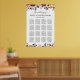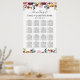 Elegante diseño de poster de tablas de asientos boda con un monograma de nombres de novias y novios y fecha de boda, texto de plantilla de personalizado para números de mesa y nombres de invitados. enmarcado por una corona de flores de color de agua de verano y otoño, incluyendo rosas, dahlias, flores de peonía y vegetación, en una espléndida paleta de otoño de color rojo burdeos, amarillo dorado, naranja de melocotón y tonos verdes.
