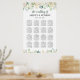 El diseño elegante del poster del gráfico de asientos boda incluye un monograma de los nombres de novias y novios y la fecha del boda, el texto de la plantilla de personalizado para los números de tabla y los nombres de invitados. Incluye un elegante diseño de borde de acuarela floral con rosas pintados, flores ranunculus y hojas. Los colores son neutros: blanco, crema, dorado, verde y gris oscuro/negro suave. Perfecto para un evento de primavera o verano.