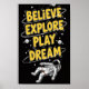 Astronaut Floating in Space Dreamy Cosmic Adventure is a captivating space art poster featuring an astronaut peacefully drifting through the cosmos. This artwork represents imagination, freedom, and inspiration with the message Believe, Explore, Play, Dream, perfect for modern wall decor and space lovers.