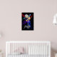 Este arte espacial digital presenta un astronauta colgado de globos en forma de los nueve planetas de nuestro sistema solar sobre un colorido fondo nebuloso con estrellas.