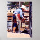 Este joven vaquero de rodeo es capturado asistiendo a sus espuelas justo antes de montar su próximo toro.