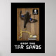 Un monte de pato con un pato mallard aceitado y muerto, equipo para mover la tierra, y un cráneo y huesos cruzados. También aparece un texto que dice "DETENGAN LAS ARENAS DE TAR". Lástima de cualquier ave acuática que desembarque en un estanque de relaves tóxicos en Alberta donde se extrae un petróleo extremadamente viscoso de las arenas de alquitrán (también conocido como arenas de petróleo) con horribles efectos ambientales. Las arenas alquitranadas de Alberta consisten en petróleo crudo pesado mezclado con arena, arcilla y betún. La extracción implica quemar gas natural para generar suficiente calor y vapor como para derretir el petróleo de la arena. Se necesitan hasta cinco barriles de agua para producir un solo barril de petróleo. Cada día millones de galones de agua están contaminados con químicos, incluyendo arsénico, cobre, plomo y zinc, para separar básicamente el aceite de arenas alquitranadas (llamado betún diluido) de la arena. Pero el agua está tan contaminada después de este proceso que tienen que almacenarla en lodos tóxicos llamados estanques de relaves. Se estima que cada día se filtran 3 millones de galones de agua contaminada desde estanques de relaves hasta el río Athabasca de Alberta, y el paisaje circundante. Por favor, di que no a las arenas alquitranadas.