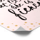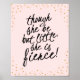 Una hermosa impresión para la pared del cuarto de tu bebé que cita a Shakespeare, "aunque ella sea pequeña, ¡es feroz!" en un texto cursivo en negrita con un aspecto de letra a mano. Tipografía contemporánea impresa en negro sobre un fondo rosa pálido de moda decorado con puntos de confeti dorados en los bordes superior e inferior.