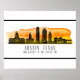 Elegante diseño de imán oval de coches con silueta de línea de horizonte de la ciudad de Austin Texas con salpicaduras de color de agua al atardecer y coordenadas de mapa de latitud y longitud