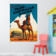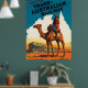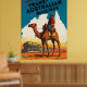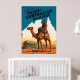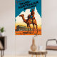 Afiche de viaje del Ferrocarril Trans Australiano, la imagen es de un soldado australiano montando camelback en las afueras de Australia.