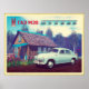 Una falsa imagen de propaganda que muestra una escena rural de la temprana Unión Soviética de posguerra. Muestra un automóvil GAZ M-20 Pobeda, frente a una dacha (casa rural de verano). A lo largo de la parte superior de la imagen se encuentra un adorno del capó "M20", texto en cirílico (ruso) que dice "Г А З" (GAZ) y un adorno lateral que se encuentra en los vehículos con texto en cirílico estilizado que dice "П о б е" (Pobeda). La imagen ha sido "envejecida" para sugerir que se remonta a los primeros años de la posguerra. La propaganda soviética interna a menudo trató de informar a la gente lo buena que era la vida en la URSS. Una dacha y un auto para llegar allí significaban la buena vida. Los habitantes de la ciudad soñaban con tener un pequeño terreno fuera de la ciudad al que huir los fines de semana de verano, lejos del calor y la suciedad de la ciudad. El Pobeda fue el primer automóvil fabricado para el público después del fin de la Guerra Mundial. El M20 se produjo entre 1946 y 1958. GAZ (Г А З es un acrónimo ruso para Gorkovsky Avtomobilny Zavod - Fábrica de Automóviles Gorsky) Pobeda (П б о е・) es la palabra rusa para la victoria. El nombre fue escogido porque el auto fue puesto a prueba por primera vez en 1943, cuando una victoria de los Aliados en la Segunda Guerra Mundial empezó a parecer probable. El Pobeda fue fabricado bajo licencia en Polonia y unos cuantos fueron ensamblados en Corea del Norte. El Pobeda fue el primer automóvil de posguerra fabricado en la Unión Soviética y el primer vehículo soviético en tener señales de giro, dos limpiaparabrisas eléctricos, un calentador eléctrico y una radio AM integrada. El auto llegó a ser un símbolo de la vida soviética de posguerra y hoy es un artículo popular de un coleccionista. Se produjeron 235.997 Pobedas. Varios M20 se han adaptado ampliamente en los últimos años. Incluso hay algunas versiones de "musculares" en la carretera.