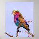 Esta es una foto de un Roller Lilac-Breast, un pájaro colorido nativo de África. Este pájaro impresionante prefiere los bosques abiertos y la sabana, y en su mayor parte está ausente de los lugares sin árboles. Habitualmente se encuentra solo o en parejas, y se perfila de manera visible en la cima de árboles, postes u otros puntos de gran potencial desde donde se pueden ver insectos, lagartos, escorpiones, caracoles, aves pequeñas y roedores moviéndose por el suelo. Esta especie es considerada extraoficialmente como ave nacional de Kenia.