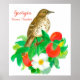 Un poster decorado con un pájaro Thrasher marrón sobre la rama de un melocotón con una flor rosa Cherokee blanca tintada con tinta y pintada con acuarela. Inspirado por el ave estatal y la flor estatal de Georgia. Puede editar o eliminar el texto para que se ajuste a sus necesidades.