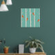 Un poster con un ilustracion de abedules y pájaros naranjas sentados en sus ramas. Fondo de color verde retro.